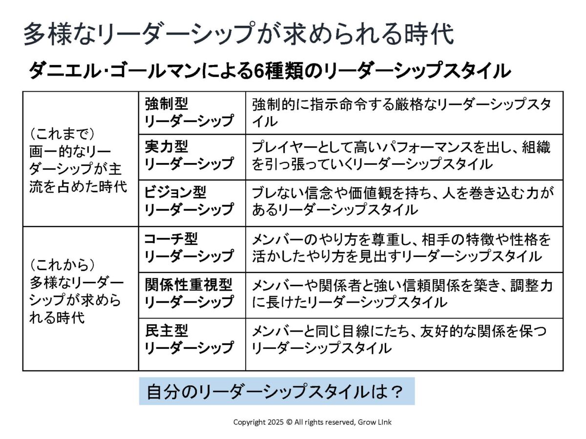 中藤さん: かつては「強制型」や「実力型」「ビジョン型」といった画一的なリーダーシップが主流でしたが、これからはメンバーの個性を活かす「コーチ型」や信頼関係を重視する「関係性重視型」、メンバーと同じ目線で友好的な関係を保つ「民主型」など、自分の強みに合ったスタイルを使い分けることが重要です。