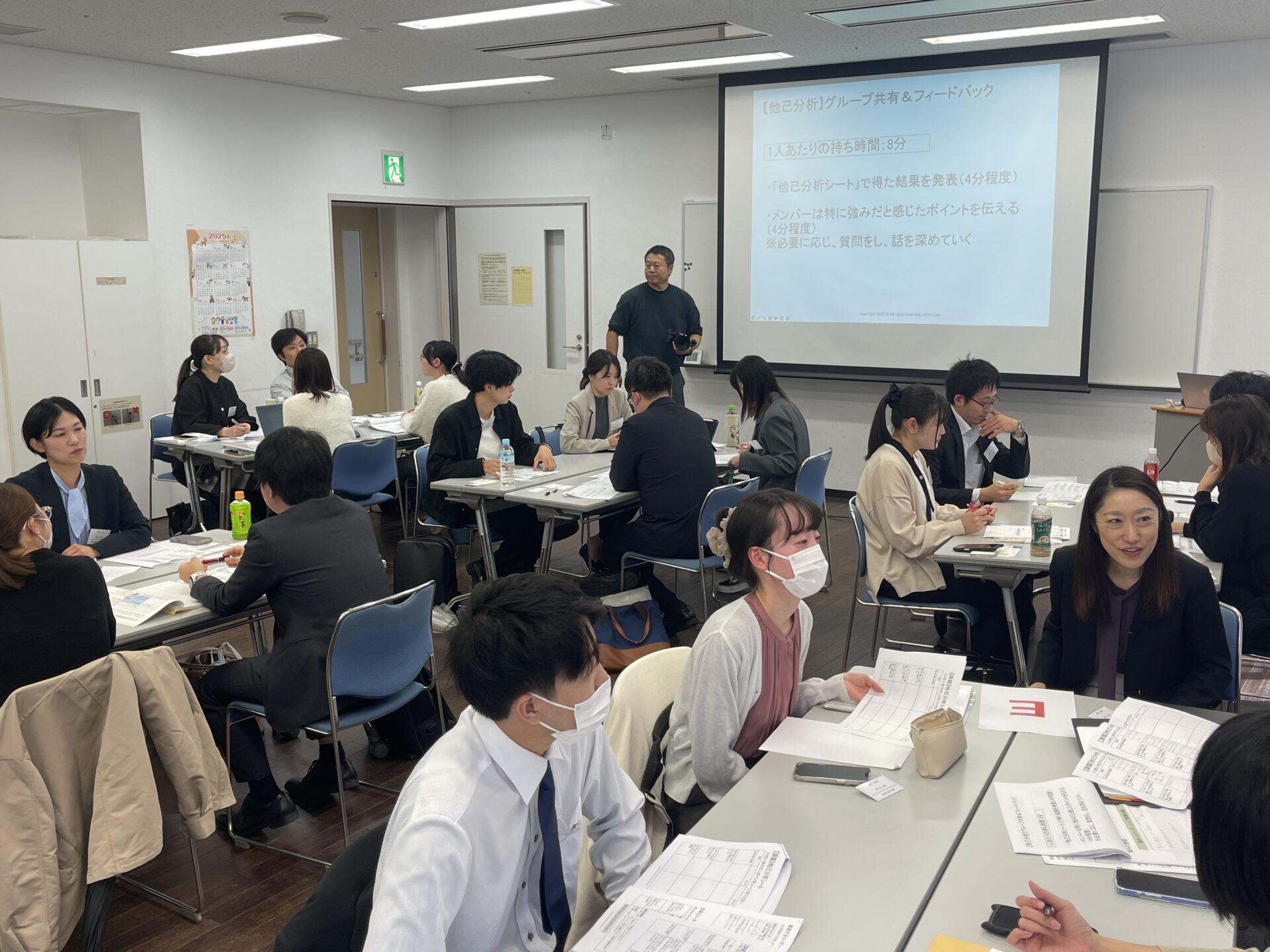 続いて行うグループワークでは、「他己分析シート」をもとに職場の上司や同僚からヒアリングしてきた自分の印象や強みを、グループ内で共有・フィードバックし、グループの代表者が全員の前で発表・共有しました。