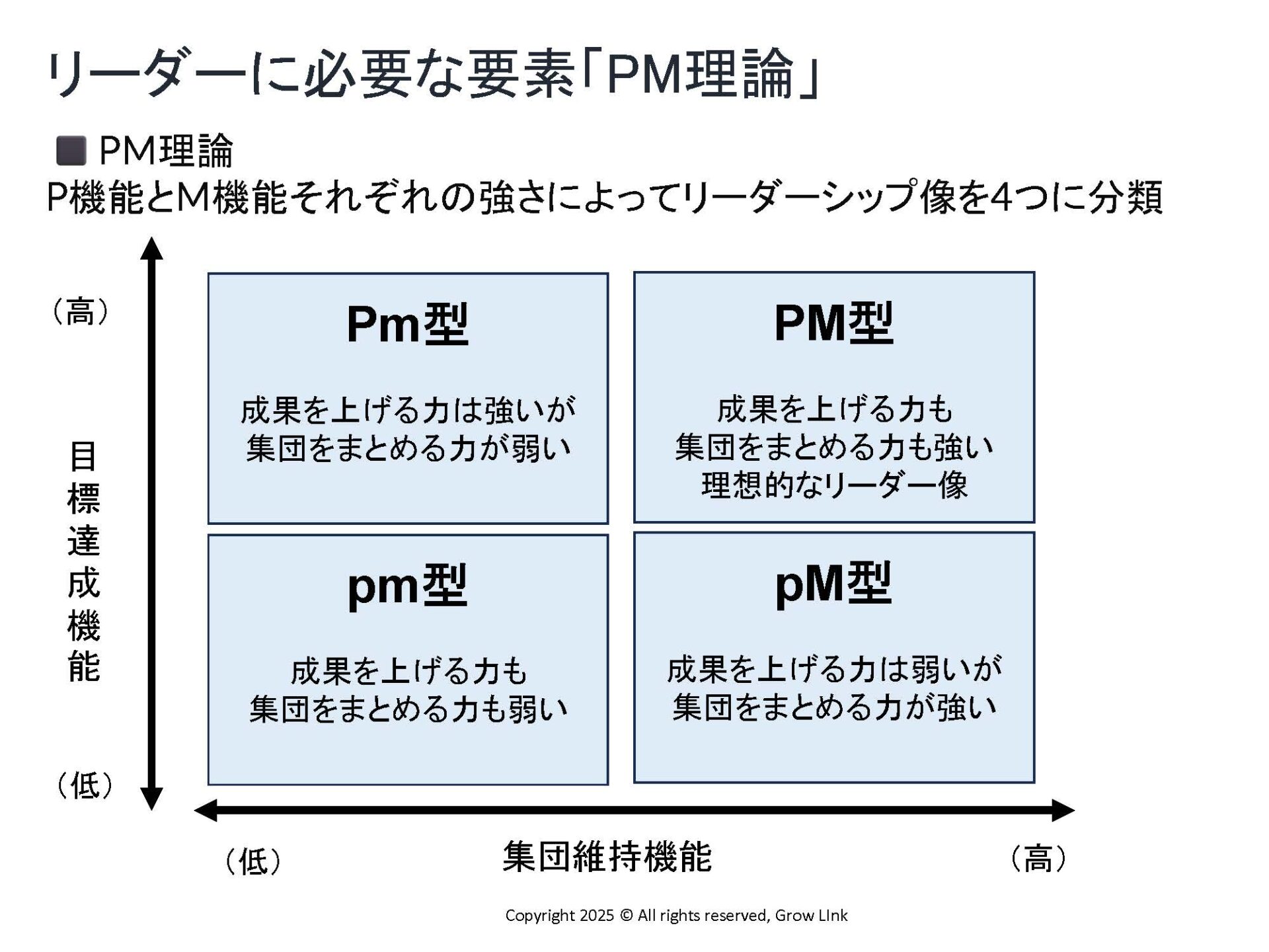 理想はこの両方が高い「PM型」です。成果は出るけれどバラバラな状態の「Pm型」や、仲は良いけれど成果が伴わない「pM型」など、まずは自分が今どの位置にいるかを把握することが大切です。