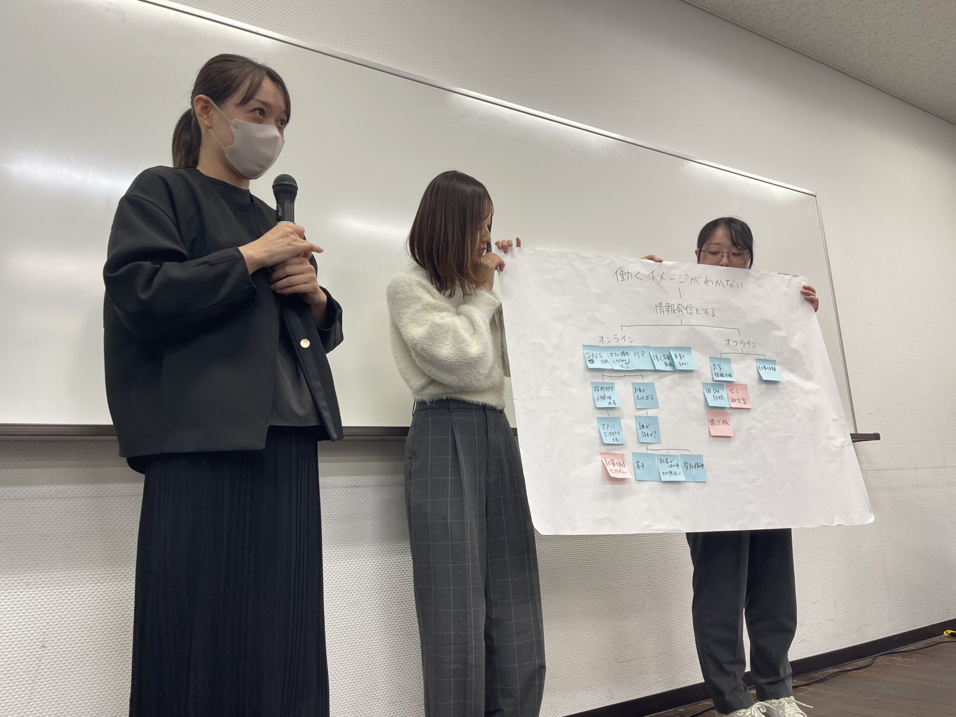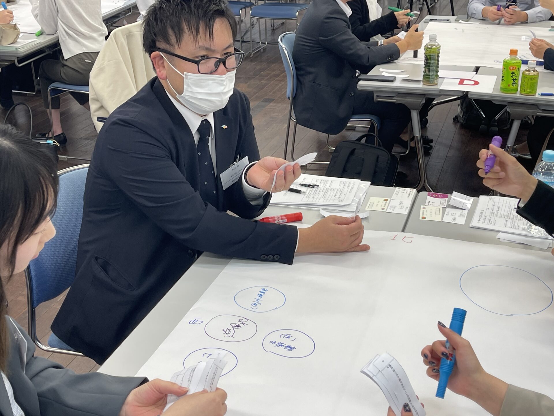 そして、中藤さんからゲームルールの説明などが行われた後、模造紙とペンが配られ、グループに分かれて演習が始まりました。制限時間30分という中、最初は混乱していたグループも、次第に「誰が情報をまとめるか」「誰が時間の管理をするか」といった役割が自然と生まれ、活発なコミュニケーションが飛び交いました 。