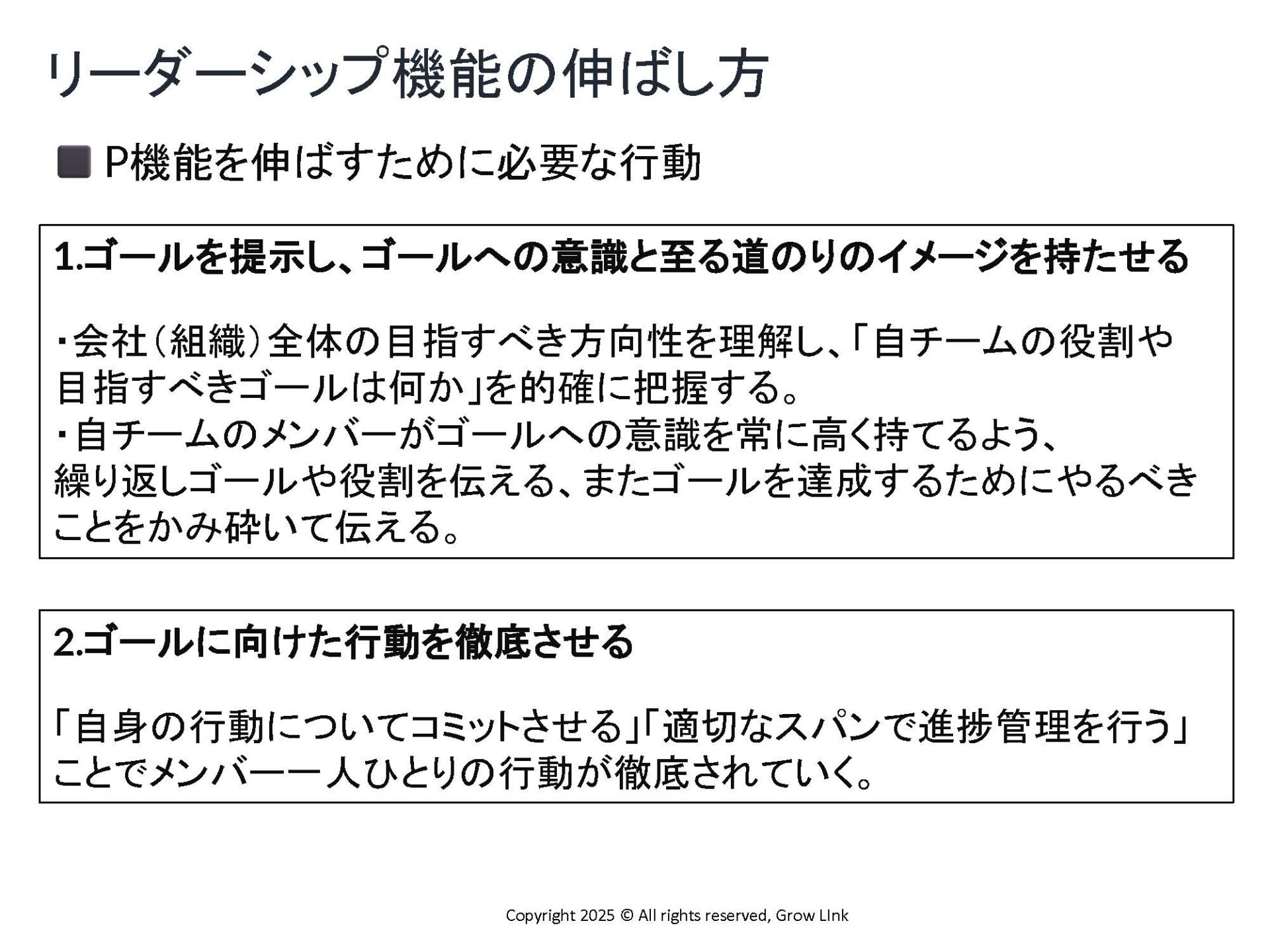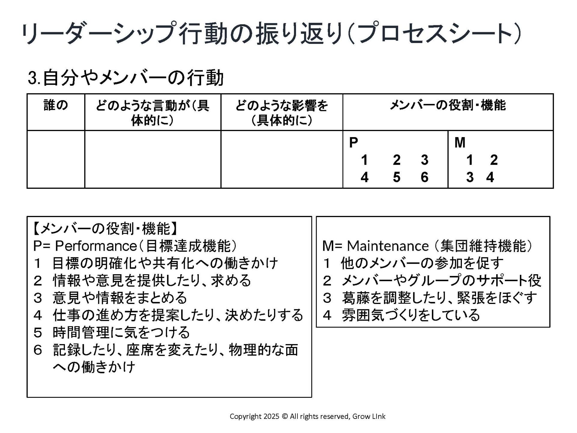 中藤さん:リーダーの役割や業務範囲はポジションによって様々ですが、共通して必要なのが「P(目標達成)とM(集団維持)」という2つの機能です。P機能は成果を上げるための力。目標を設定し、計画を立て、業務を効率化していく役割ですね。一方でM機能は、チームワークを維持するための力です。メンバー一人ひとりを気遣い、声がけをして、人間関係を構築していくなどの役割を指します。