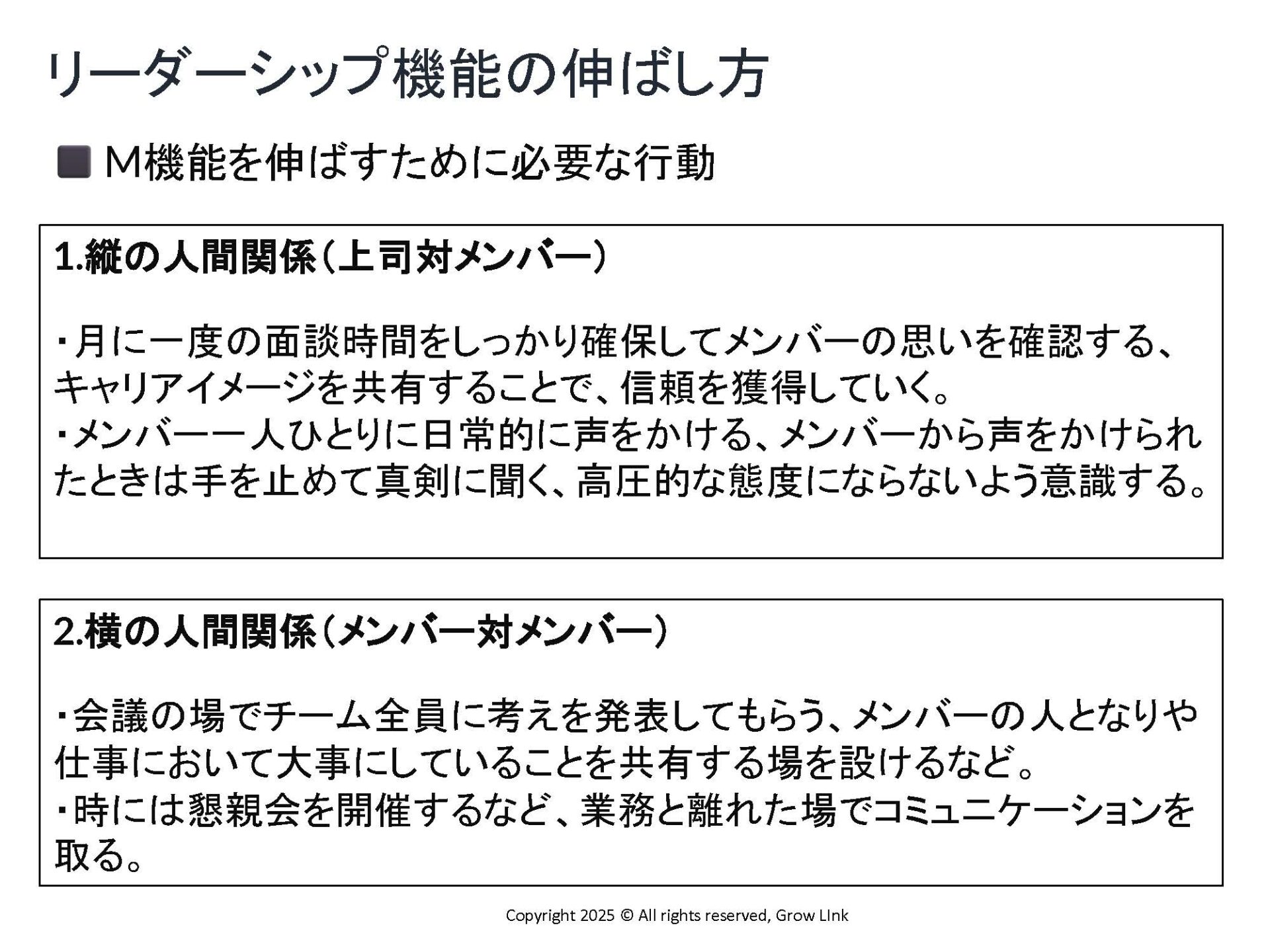中藤さん:もしP機能を伸ばしたい場合は、メンバーに明確なゴールを提示し、そこに至る道のりを具体的にイメージさせるはたらきかけをしてあげてください。また、業務把握と適切な業務分担も必要になってくると思います。M機能を伸ばしたいなら、メンバーと上司の関係性で一対一で話をする時間を設けるなど、「縦の関係」を意識する。一緒にメンバー同士の状態や関係性を見て、対話の場を作るなど「横の関係」を伸ばす。この両方を強化していくことで、メンテナンス機能を上げていくことができます。