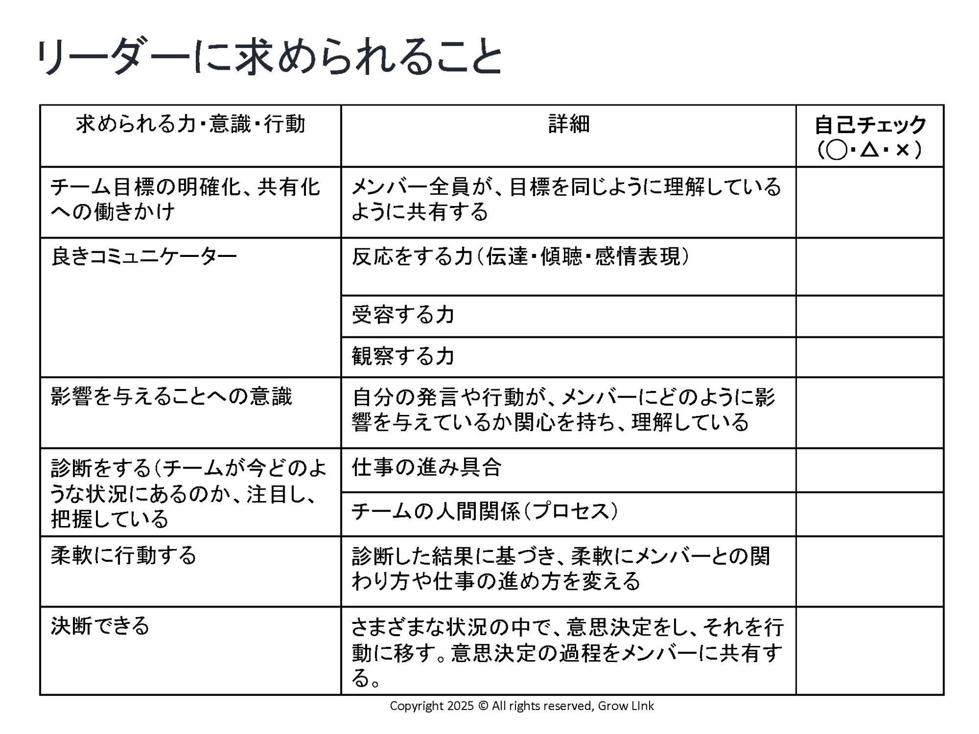 そして、「リーダーに求められること」について書かれたシートを各々でチェックしていきます。