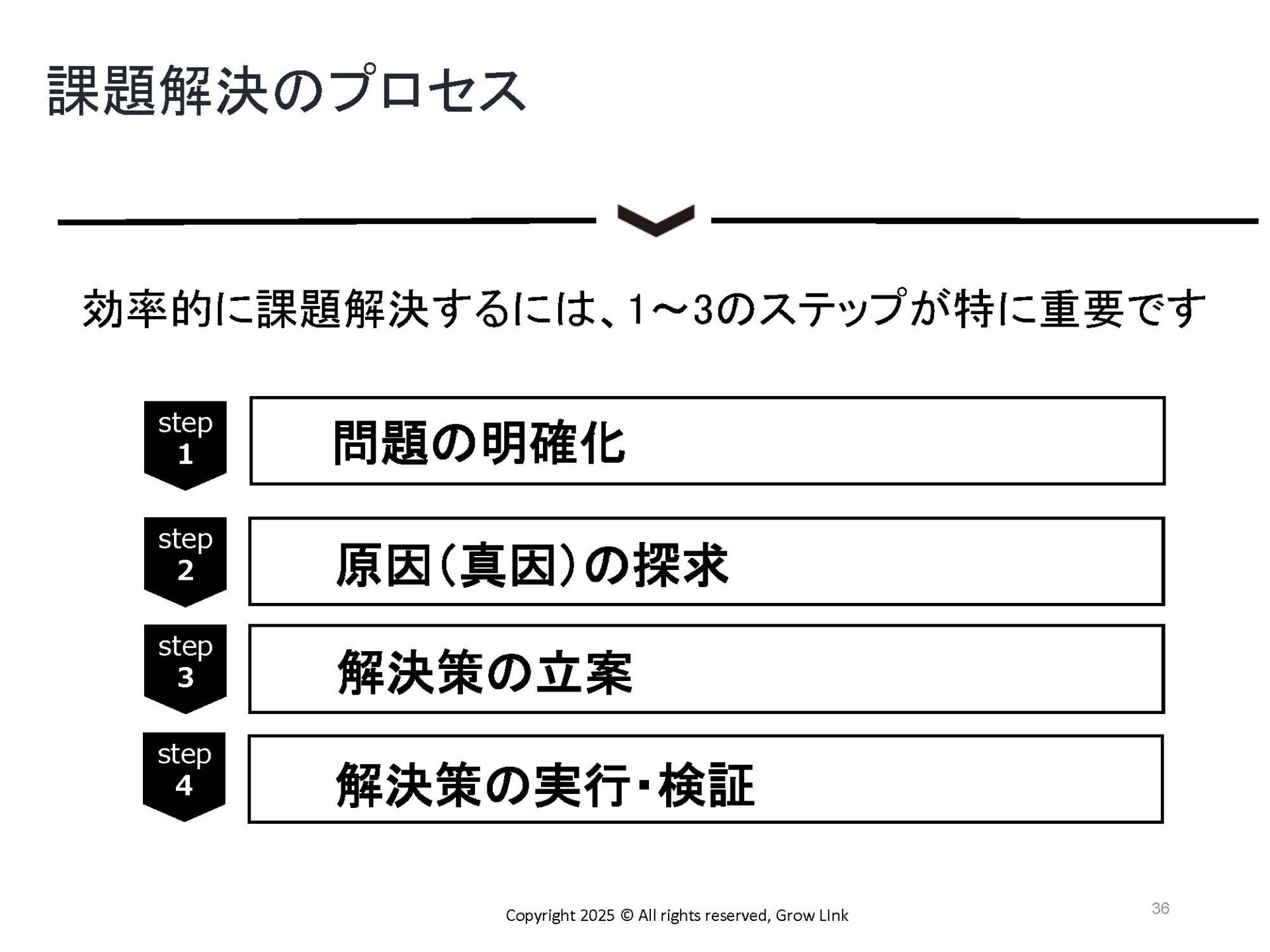 中藤さん:ここからは、現場で直面する様々な課題をどう整理し、突破していくか。その具体的なプロセスを学んでいきましょう。課題解決力とは、単に目の前の問題を片付けることではありません。何が起きているのかを客観的に分析し、その本質的な原因を突き止め、解決のために「人・情報・お金」といったリソースをどう活用するかを見極める力のことです。