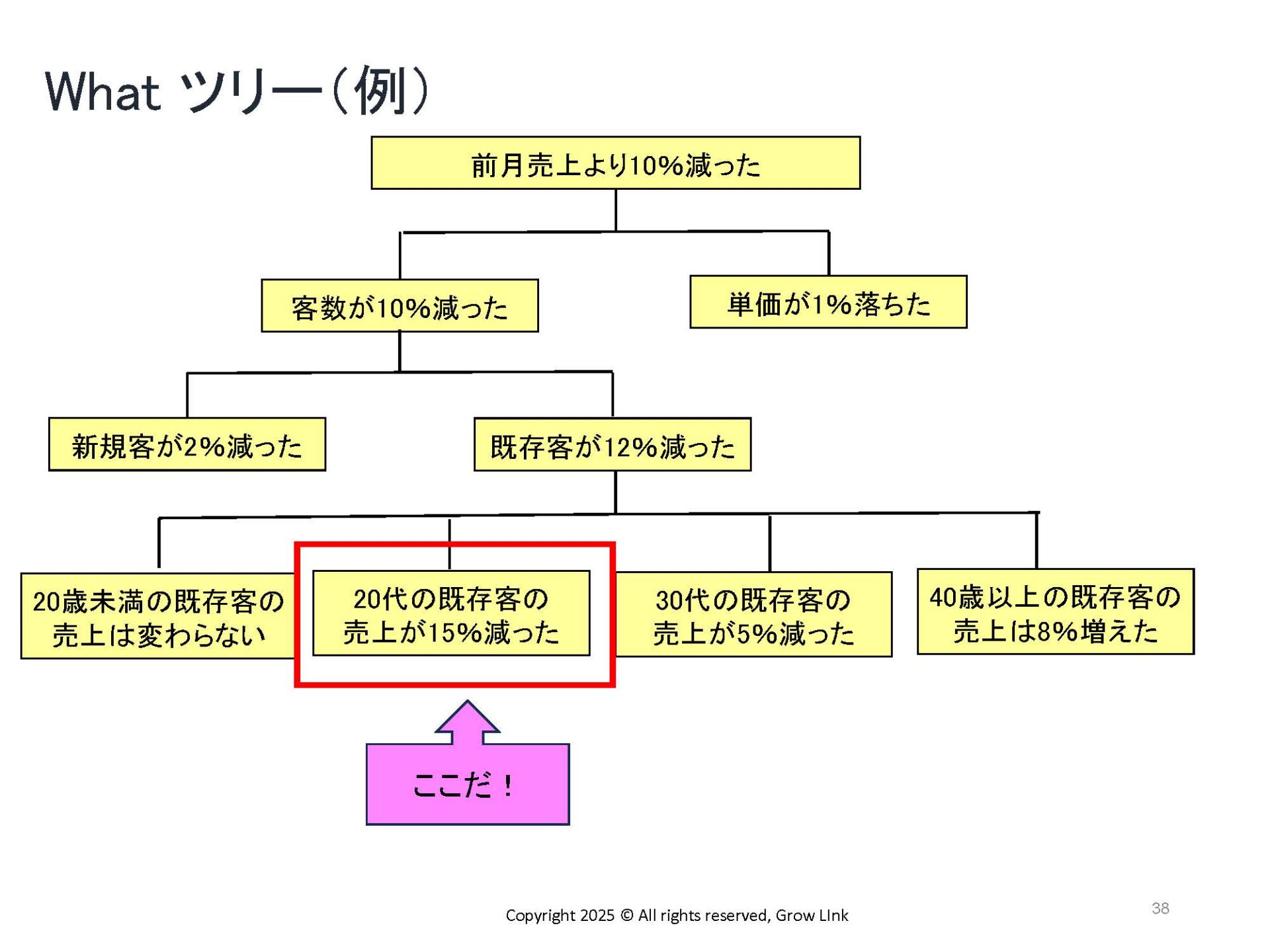 そして、実際にワークを行う上で「課題解決のプロセス」とそのためのフレームワークである「Whatツリー」「Whyツリー」「Howツリー」についても解説していただきました。